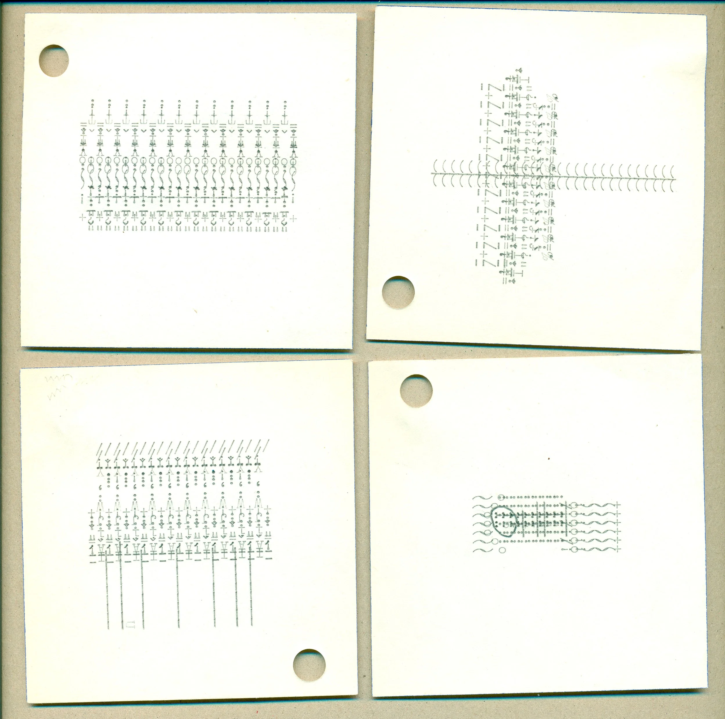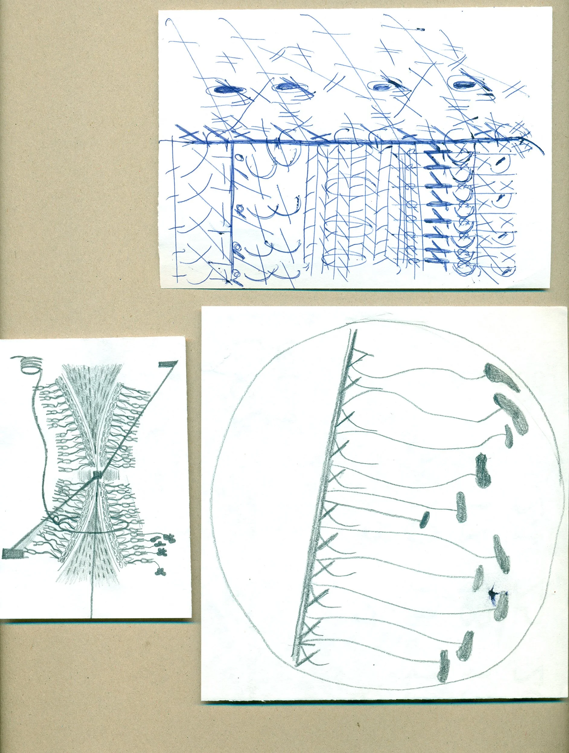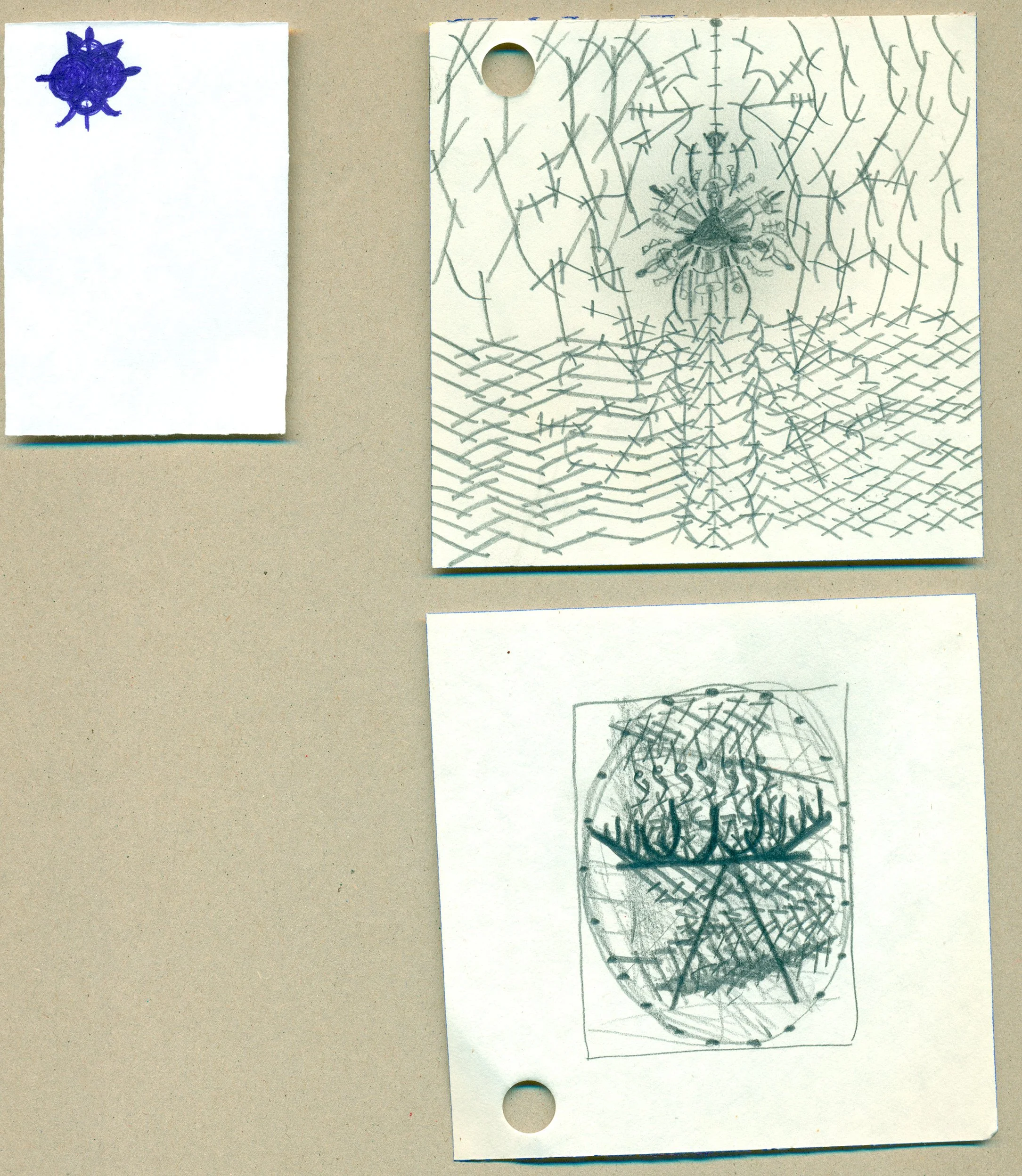 Drawings / test runs on small formats, filled with fast and loud repetition of signs and letters. Rows and columns of recognizable sounds and messages cease to exist.